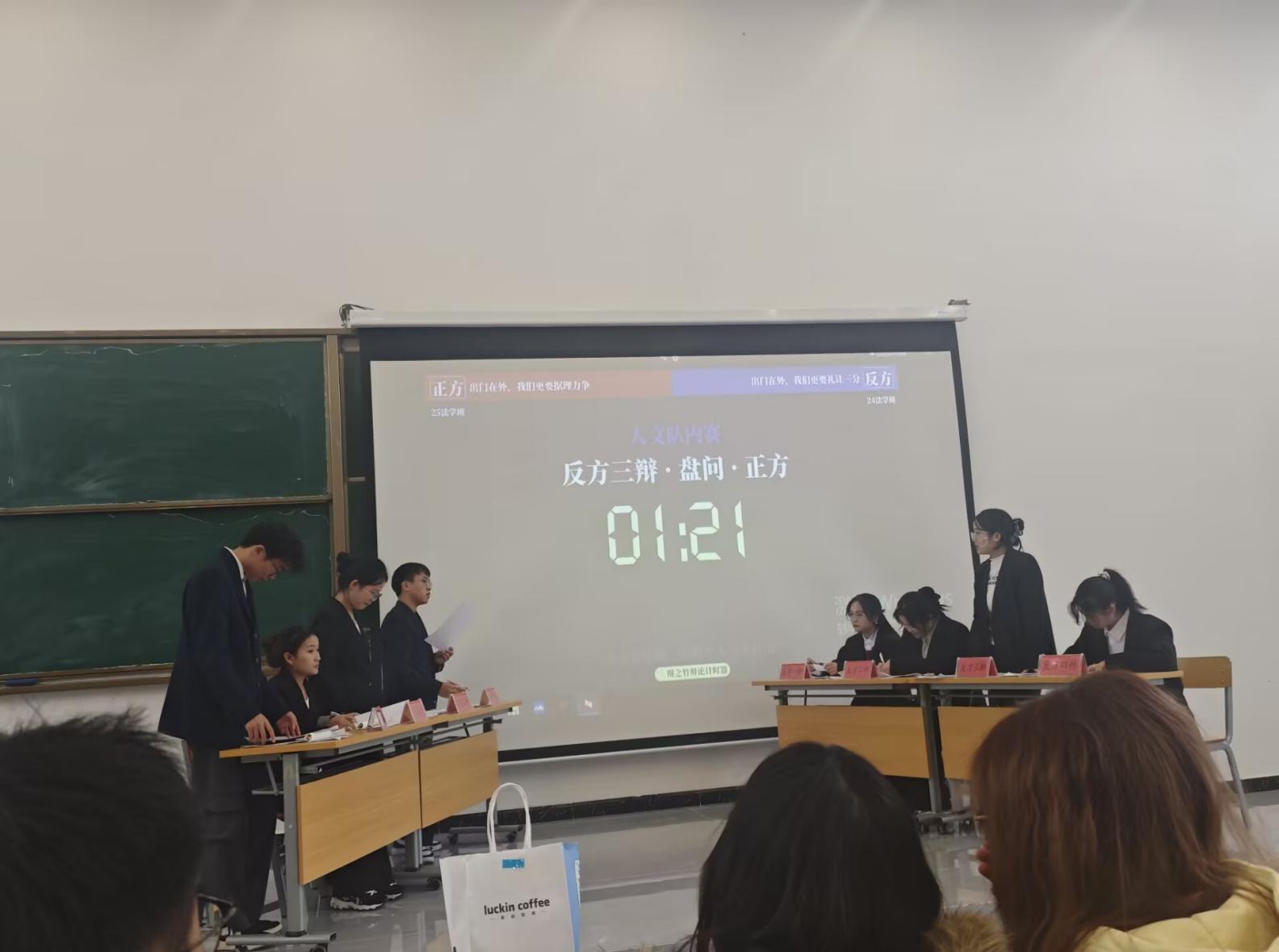 在初赛点燃思辨激情、汇聚青年观点的基础上,“金秋”辩论赛正式迈入更为激烈与深度交锋的半决赛阶段。为进一步推动赛制升级、观点升华与思想碰撞,人文与管理学院于2025年11月22日在国合楼2-7举办了2025年度“金秋”辩论赛半决赛。本次活动由学院团委主办、学院艺术团承办。