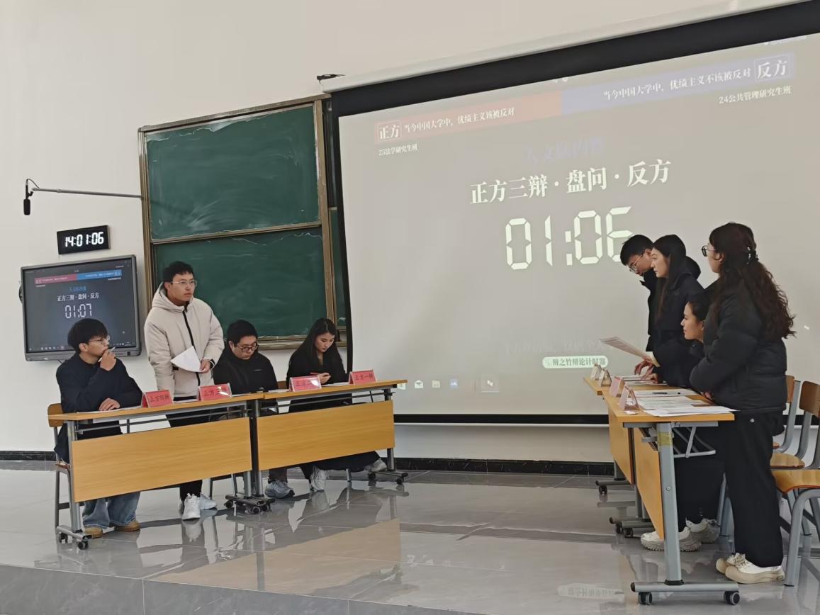 本次辩论赛采用淘汰制,下午首轮对阵方为25级法学研究生二班与24级公共管理研究生,次轮对阵方为25法学班与24级法学班,辩题为“当今中国大学,优绩主义该/不该被反对”和“出门在外,我们更要据理力争/礼让三分”。