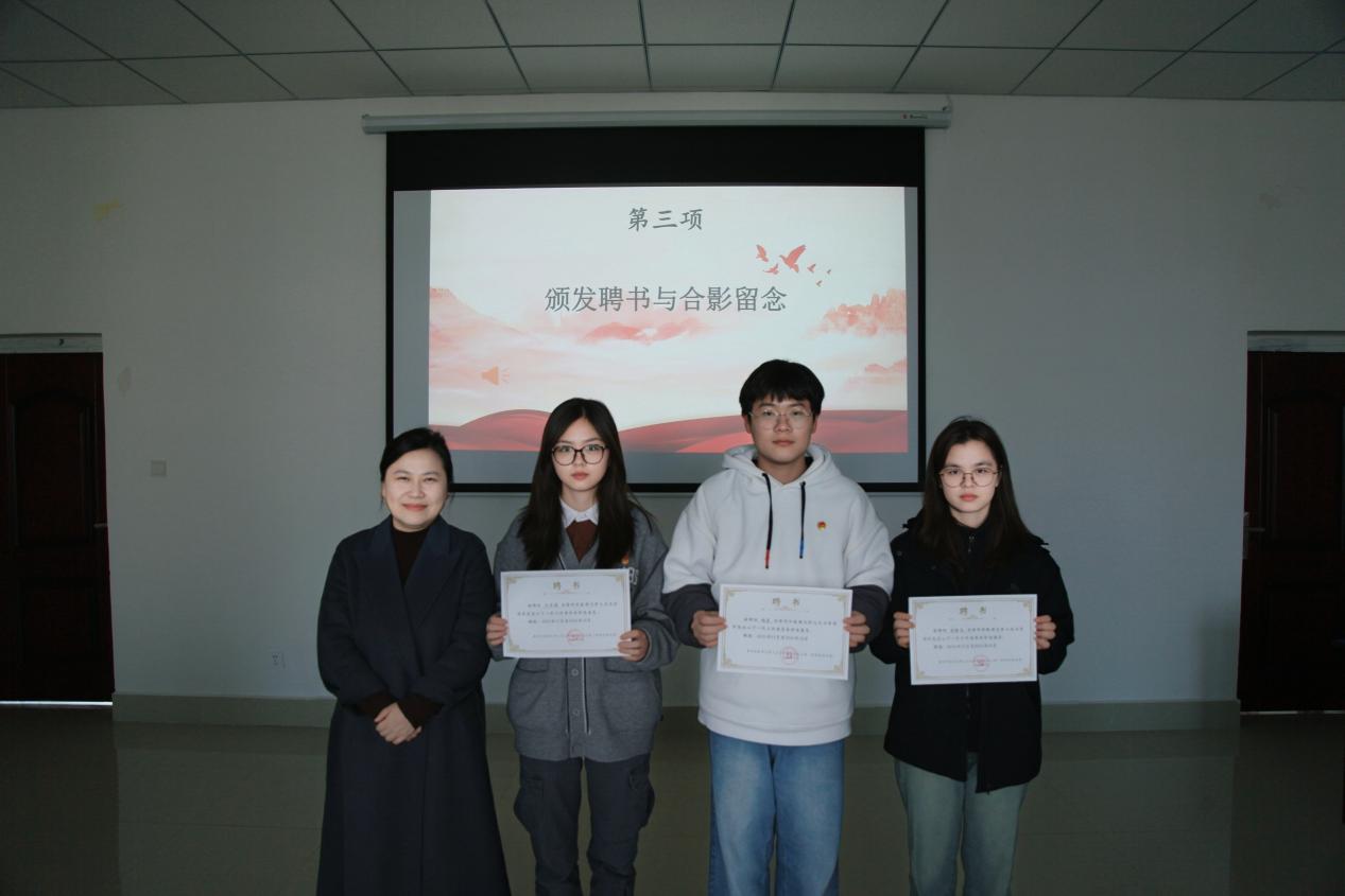 会议在庄重热烈的氛围中正式召开。会上回顾了设立关工委学生委员的初衷与实践成效,强调学生委员队伍是学院关工委联系学生群体的重要力量,是推动“五老”育人、深化思想政治引领、加强朋辈陪伴和心理支持的重要载体。会议宣读了《关于聘任人文与管理学院关工委第二届学生委员的决定》,并为杨宵、王子淯、胡静文三位新任委员颁发聘书。