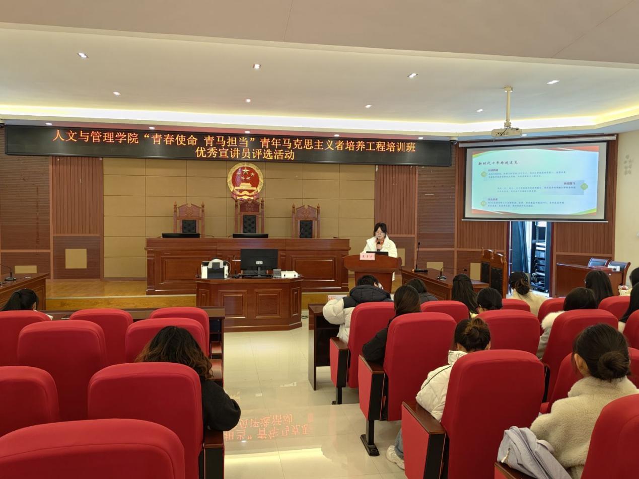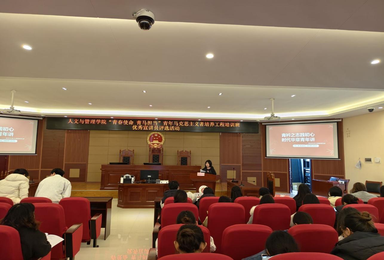 为深入开展“新时代伟大成就青年讲”主题教育活动,扎实推进青年马克思主义者培养工程,引导青年学生在宣讲实践中坚定理想信念、强化使命担当,12月8日,院团委在笃学楼模拟法庭开展“青春使命·青马担当”青年马克思主义者培养工程培训班优秀宣讲员评选活动。学院团委副书记杨宵主持活动,全体青马班学员参加。