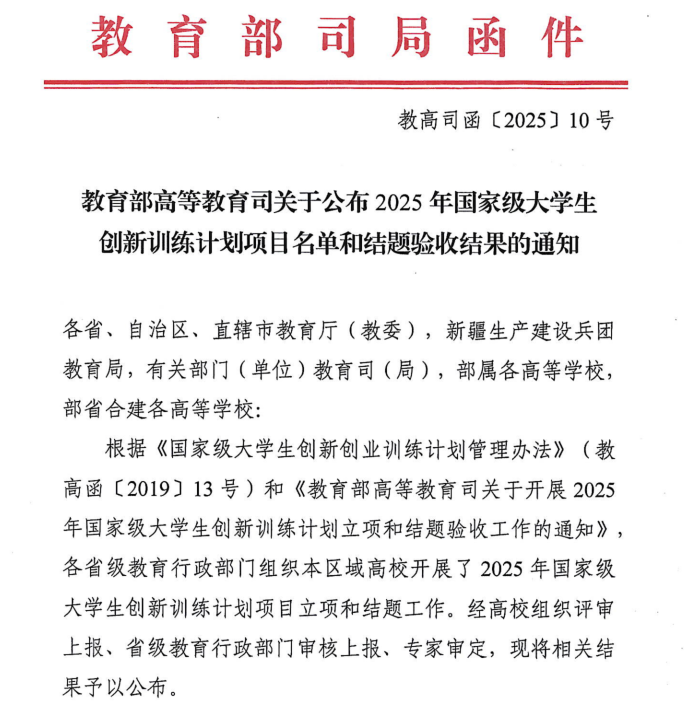 近日,省教育厅办公室转发《教育部高等教育司关于公布2025年国家级大学生创新训练计划项目名单和结题验收结果的通知》,我院共获国家级项目4项、省级项目11项立项,立项总量同比激增120%,创历史新高回溯十年,学院年立项数由最初的3项逐步爬升,至2024年达14项,今年再跳一级,实现“量质双跃升”