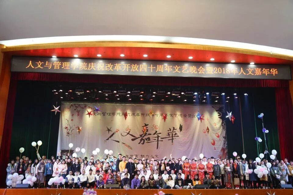 2018年12月14日,人文与管理学院庆祝改革开放四十周年文艺晚会暨2018年人文嘉年华在学校大礼堂隆重举行。学校党委书记、院长陈瑶教授,党委正处级专职组织员庄田畋教授,副院长黄江华教授及学院各专业师生共1500余人参加晚会。